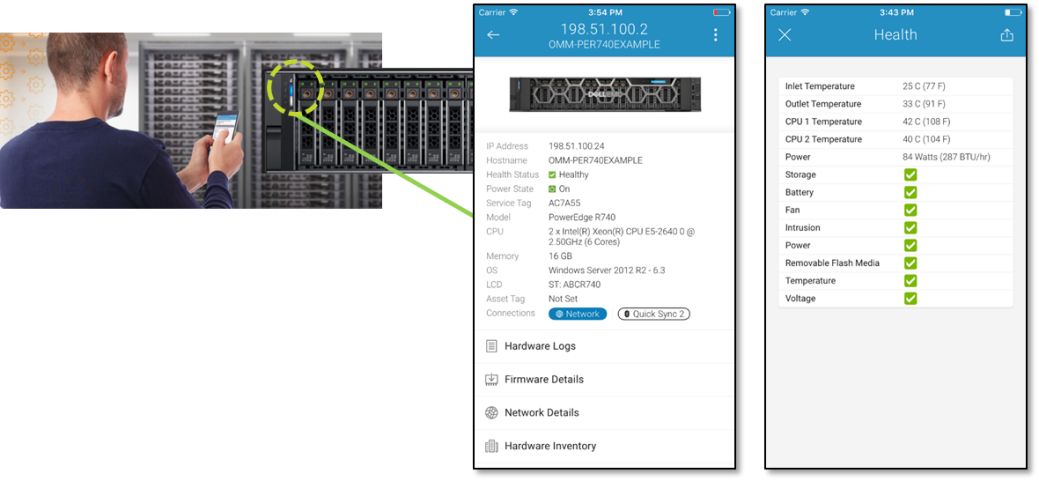 運維人員只需攜帶一根數據線連接前面板USB管理口,無需插拔任何其他線纜,即可直接與Web界面、WSMan等iDRAC界面交互,實現管理和維護功能,方便安全(此功能免費)。